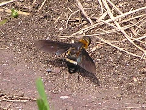 3〜4m 離れたところから望遠で撮影。地面に尻をつけては飛び去るという行動を何度もしていた。産卵だろうか?