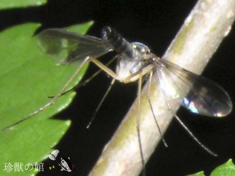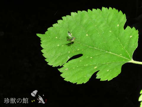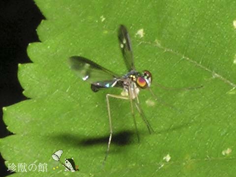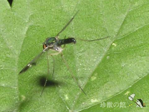 科名 アシナガバエ科 学名 Mesorhaga nebulosus または Psilopus nebulosus 中名 ? 撮影日 2004/06/08 撮影地 東京都葛飾区 特徴 ・体長 7mm くらい。アシナガキンバエより少し大きい。 ・キンバエに似た緑色の光沢 ・体に対して足が長い ・足には剛毛はない ・腹が細く長い→オス ・翅に黒いまだらがある ヤマトマダラアシナガバエというのもいるらしいが、これと同種の異名なのか別種なのかよくわからない。アブは難しいわ(っていうか昆虫は難しくてよくわかんないわ。学者の人たちが偉い)。