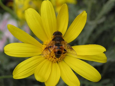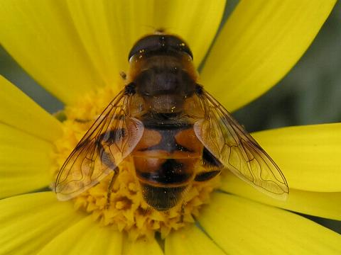 科名 ハナアブ科 学名 Eristalis tenax 中名 ? 別名 ハナアブ 撮影日 2004/11/13 撮影地 東京都葛飾区 特徴 ・全身に飴色の毛が生えている ・体長 18mm くらい ・両目がくっついてる→オス ・後足は黒く、前・中足に白い斑がある ・翅の一部が黒い 実のところシマハナアブとナミハナアブの見分け方をよく知らない。あちこちで写真を見る限りでは、ナミハナアブは翅の一部が黒い。