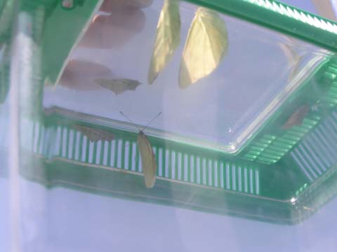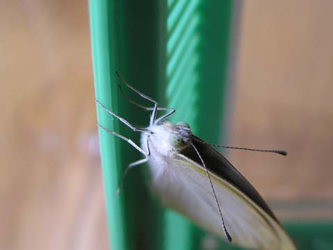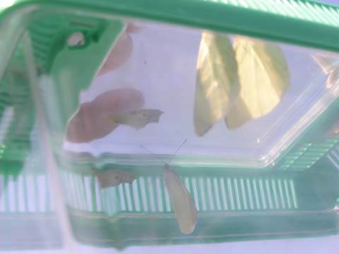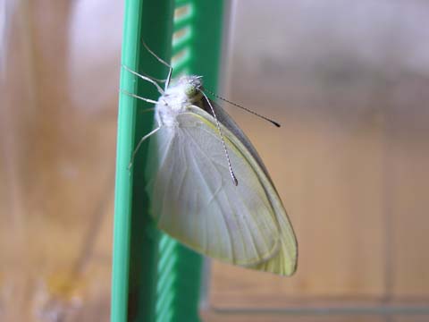 約一週間後、三頭が一斉に羽化した。モンシロチョウの羽化はあっという間だ。朝見た時はなんともなかったのに、ご飯を食べてるあいだに出てきてしまった。 |