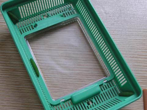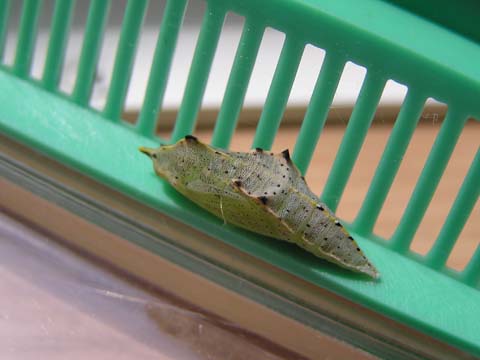 モンシロチョウはまわりの色にあわせた色の蛹を作る。不透明な枠の部分にくっついているやつは濃いくすんだ緑色をしているし、透明な部分にくっついている蛹は、透明感のある明るい黄緑だ。