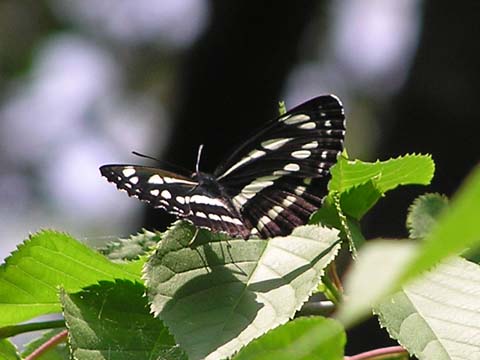 科名 タテハチョウ科 学名 Neptis sappho 中名 小三線蝶 撮影日 2007/05/13 撮影地 埼玉県児玉郡上里町 特徴 ・黒字に白い三筋の線 ・前翅の白線が黒い地色でふたつに分けられている(コミスジ特有の模様) オスは後翅に灰色に光る部分がある。左の写真にはそれが見られないのでメスかと思うが、たんに隠れて見えないだけかもしれない。