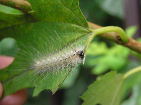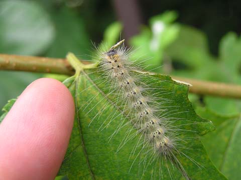 科名 ヒトリガ科 学名 Hyphantria cunea 中名 米國白蛾 撮影日 2003/08/10 撮影地 東京都葛飾区 特徴 ・白い毛虫で背中に黒い点が線状にならんでいる ・若幼虫のころは木の葉を糸でつづりあわせて巣をつくり集団で暮らす ・さまざまな樹木の葉を食べる。 写っている木はラクウショウ。アメリカシロヒトリが針葉樹につくのは珍しい気がするので自信はない。