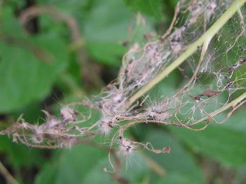 科名 ヒトリガ科 学名 Hyphantria cunea 中名 米國白蛾 撮影日 2008/07/10 撮影地 東京都葛飾区 特徴 ・白い毛虫で背中に黒い点が線状にならんでいる ・若幼虫のころは木の葉を糸でつづりあわせて巣をつくり集団で暮らす ・さまざまな樹木の葉を食べる。 写っている木はクワ(桑)。養蚕の盛んな地域ではクワ樹の害虫として嫌われている。毒を持つと信じられているが迷信である。アメリカシロヒトリには毒針はなく、障っても害はない。