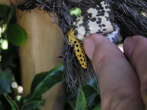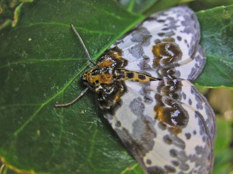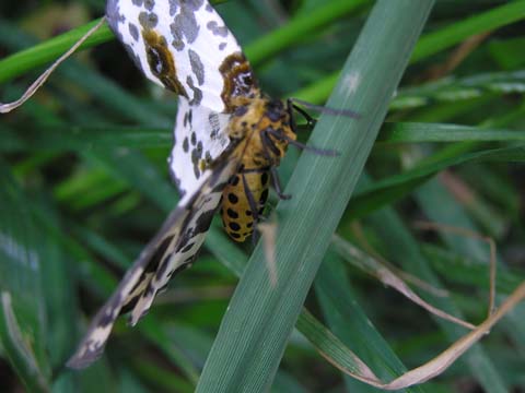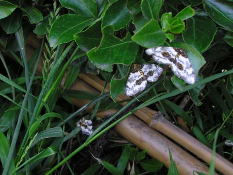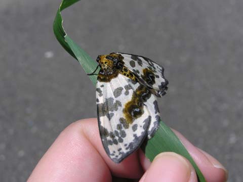 科名 シャクガ科 学名 Abraxas miranda 中名 撮影日 2006/05/20 撮影地 東京都葛飾区 特徴 ・翅をやや開いた感じの△にたたむシャクガ科特有のとまりかた。 ・翅は白地に灰色の斑紋。翅の付け根付近と前翅・後翅の後端中央よりに黒い斑紋があり、まわりが黄色くにじんだ感じになっている。 ・腹は黄色く、黒い水玉模様がある。 他の写真 [1][2][3][4][5][6][7] 高解像度の写真あり メモ: 似たものにヒメマダラエダシャクとクロマダラエダシャクがあり、ヒメ……のほうには前翅の灰色の斑のなかに黒っぽい輪状紋がある。クロ……のほうは見分け方を知らないので(たぶんユウマダラよりも灰色紋が黒いんだと思うけど)、この写真もユウマダラだと言い切る自信がない。 写真のものは羽化した直後だったのか、食草であるマサキの垣根に見える範囲だけで20〜30頭とまっていた。前日まで雨続きで久しぶりに晴れた日の午前中だった。午後から夕立で東京ではめずらしく虹が出た。 |