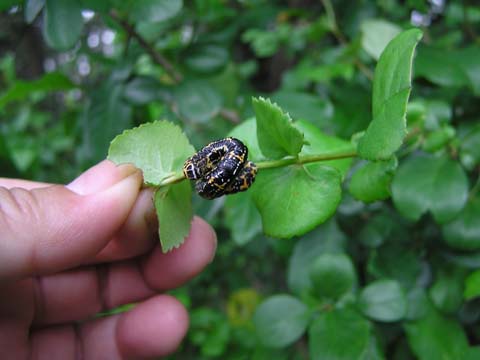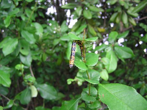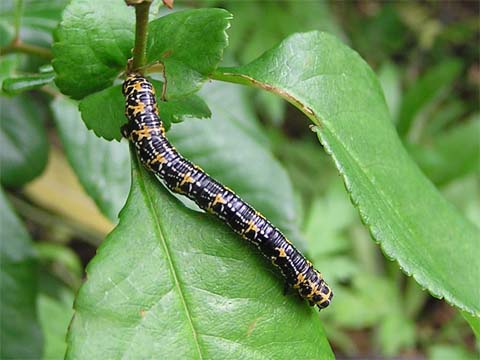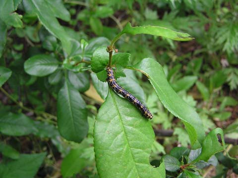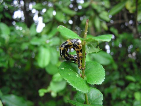 科名 シャクガ科 学名 Abraxas miranda 中名 撮影日 2007/05/19 撮影地 東京都江戸川区 特徴 ・黒と黄色の色分け。 ・胸脚と腹脚のあいだが離れている尺取り虫体形。 ・つつくと左の写真のように体を丸めてしまう。 食草はマサキ、マユミ等のニシキギ科樹木の葉。写真のものはマサキ?