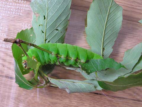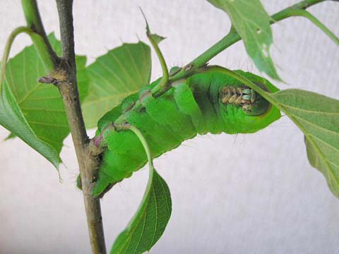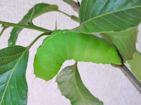 別名 ヤママユ テンサン(天蚕) 科名 ヤママユガ科 学名 Antheraea yamamai 中名 和大透目天蠶蛾 日本天蠶 撮影日 2006/05/22 撮影地 採集地 長野県 特徴 ・体長60mmくらい。かなり大きな芋虫で太さもある。 ・体のところどころに突起があり、まばらに毛が生えている。 ・わき腹に薄い黄色の筋がある。 他の写真 [1] 糞 [2] 2006/05/24 [5][6] この写真をとったあとに繭を作り始める 以上高解像度の写真あり メモ: 普通の蚕に対して野生の蚕という意味で天蚕(てんさん)と呼ばれるがカイコとは科の違うまったく別の虫。食草はコナラ、クリ、クヌギ、カシワ、などのブナ科とサクラ、リンゴ、ナシなどのバラ科の樹木の葉。昆虫料理研究会のBugeaterさんより終齢幼虫をいただいた。