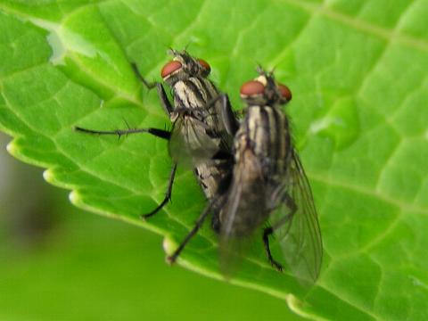 科名 イエバエ科 学名 Muscina stabulans 中名 厩腐蠅 大家蠅 撮影日 2003/07/11 撮影地 東京都江戸川区 特徴 ・胸部背面の四本の縦線 ・腹部に黄色い斑文がないこと ・左の写真のものは交尾中で下が♀ じっくり観察する前に逃げられてしまった。背中の線は別の角度から写した写真も用意したが写りが悪く参考にしにくい。 イエバエの背中にも四本の線があって良く似ているが腹に黄色い斑文があるので見分けられる(らしい)。