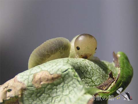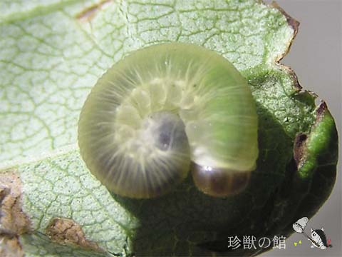 科名 ?科 学名 中名 撮影日 2004/06/27 撮影地 東京都葛飾区 特徴 ・体色は緑色でいくらか透けた感じ ・頭はわずかに黒いが、やはり透けた感じ ・たまに鮮やかな黄緑色の個体がいる(脱皮直後のものか?) ・トネリコの葉を食べる ハバチの仲間であることは確か。食べている樹木の名前がわからなかったので区役所に問い合わせてみたところ「トネリコ」であるとのこと。