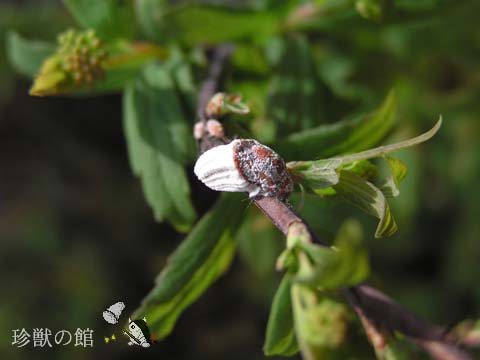 科名 イセリアカイガラムシ科 または(ワタフキカイガラムシ科) 学名 Icerya purchasi 中名 吹綿介殼蟲 別名 ワタフキカイガラムシ 撮影日 2004/03/19 撮影地 東京都江戸川区 特徴 ・白い分泌物に包まれている→メス ・分泌物はフワフワで乾いている ・大きさは 1cm くらい(分泌物含む) これ 1 匹だけユキヤナギの枝にへばりついていた。写真に写っている白いフワフワ自体は虫ではなく、虫の分泌物が固まったもの。本体は