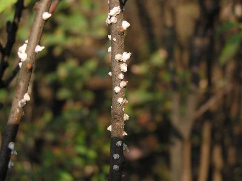 科名 カタカイガラムシ科 学名 Ceroplastes ceriferus 中名 角蝋[虫介] 撮影日 2003/08/22 撮影地 東京都江戸川区 特徴 ・蝋状の白い分泌物に包まれている ・分泌物は手でつぶすとペースト状になる この手のロウムシはけっこうたくさんいるみたいなので良くわからないが、たぶんツノロウムシだと思う。仲間のイボタロウムシ(イボタロウカイガラムシ)は分泌物で枝全体がぬんめりとコーティングされた感じになる。