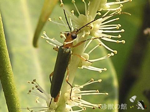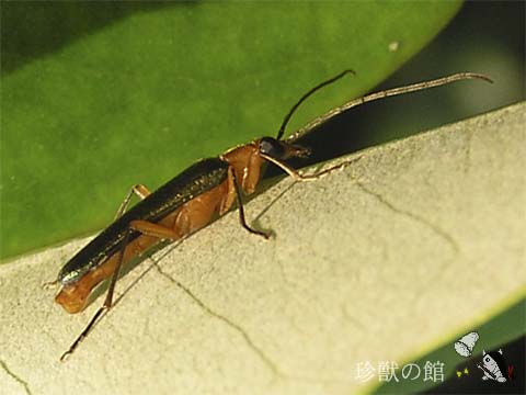 科名 カミキリモドキ科 学名 Xanthochroa waterhousei 中名 ? 撮影日 2005/05/25 撮影地 東京都葛飾区 特徴 ・体長 20mm くらい ・頭・胸・足は飴色で、前翅は緑色で鈍い光沢がある。 ・触角が糸状で長く、体型がカミキリムシに似ているが、小さい。 乱暴に扱うと体液を出すが、これにはカンタリジンという毒があり、触れると水ぶくれになって痛がゆい。捕まえる時は充分に注意すること。