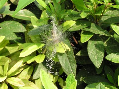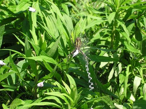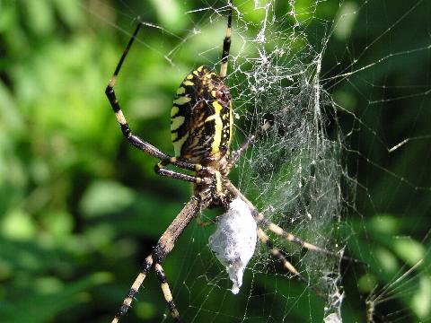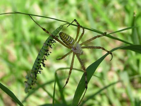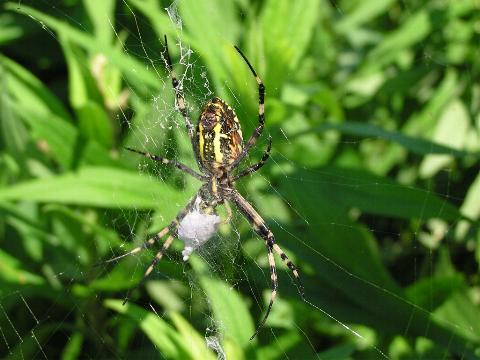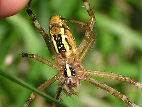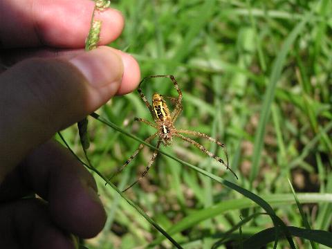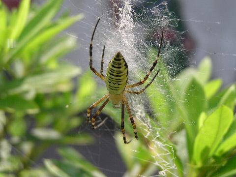 科名 コガネグモ科 学名 Argiope bruennichii 中名 横紋金蛛 撮影日 2003/08/10 撮影地 東京都葛飾区 特徴 ・丸い網を垂直に張る ・巣にジグザク模様の隠れ帯がある ・長い足 ・腹部背面は黄色と黒の横縞 ・触肢の先が細い→メス 他の写真 [1][2] 背面から [1] 巣の写真 [1][2] 若い個体? [1][2][3] 03/08/21 [1][2] |