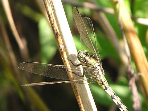 別名 ムギワラトンボ 科名 トンボ科 学名 Orthetrum albistylum 中名 白尾灰蜻 撮影日 2003/08/22 撮影地 東京都江戸川区 特徴 ・全体に黄色っぽい ・尾に黒い横縞がある ・シッポの先が白い オスは腹に青白い粉をふいている。ぜんぜん別のトンボに見える。オオシオカラトンボのメスも同じ色をしているが、翅の付け根が黒い。