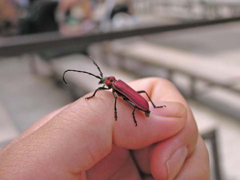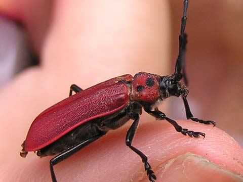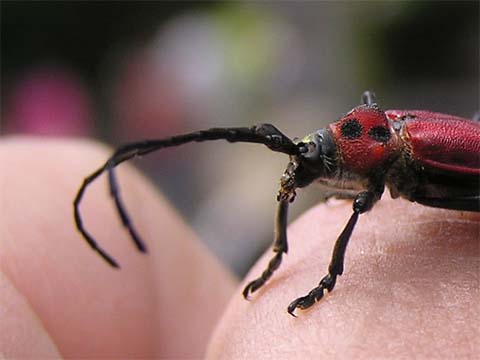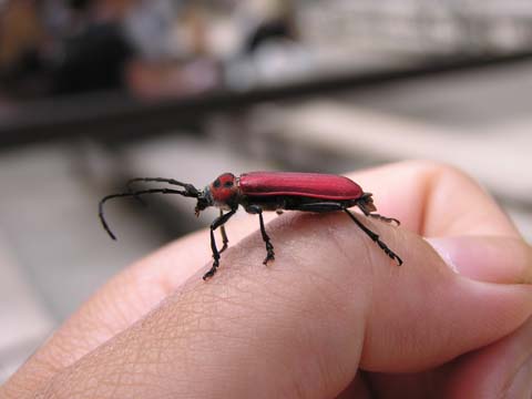 科名 カミキリムシ科 学名 Purpuricenus temminckii または Sternoplistes temminckii 中名 竹紅天牛 撮影日 2007/05/27 撮影地 千葉県市原市(ぞうの国) 特徴 ・赤くて足や触角は黒く、胸部の背に黒い斑がある(この斑は個体により変化がある)。 ・胸部に黒い縁がない。>[2] ・前翅に黒い点がない。 幼虫は竹の茎を食い荒らす。よく似たヘリグロベニカミキリは胸部の縁が黒く、前翅に一個ずつ黒い点がある。