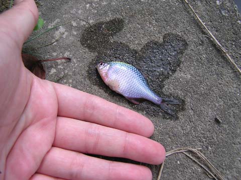 科名 コイ科 学名 Rhodeus ocellatus ocellatus 中名 撮影日 2007/07/08 撮影地 東京都葛飾区 特徴 ・美しいバラ色をしている→オス 写真の個体は死んで浮いていたもの。