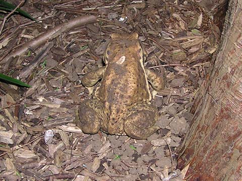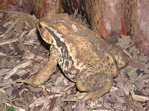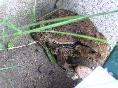 亜種名 アズマヒキガエル 別名 ガマガエル(蝦蟇蛙) 科名 ヒキガエル科 学名 Bufo japonicus formosus 中名 蟾蜍 撮影日 2007/08/1 撮影地 東京都葛飾区 特徴 ・目の後ろから体の側面に黒い帯状の斑がある。 ・背中に無数のイボがある。 ・水中ではなく林の中の乾いたところで夜見かける。 ニホンヒキガエルのうち、近畿以東の本州と山陰地方にいる亜種がアズマヒキガエル、それより西のほうにいる亜種はサツマヒキガエル(ニホンヒキガエル)。