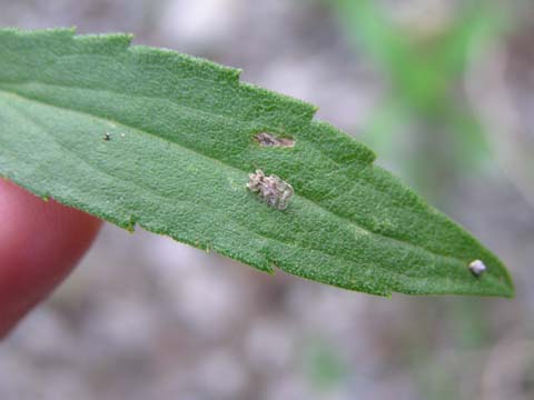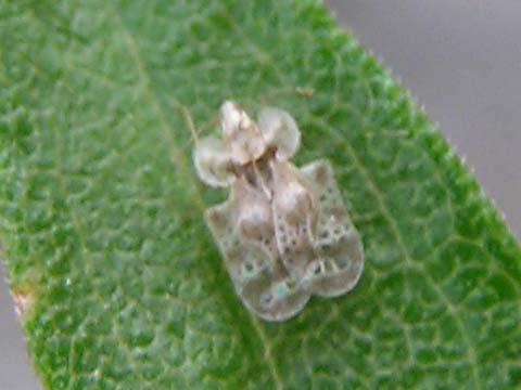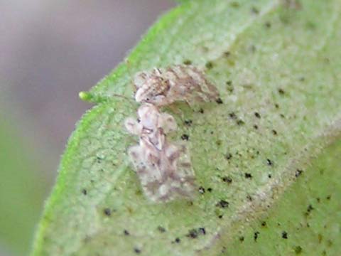 科名 グンバイムシ科 学名 Corythucha marmorata 中名 撮影日 2007/07/05 撮影地 東京都葛飾区 特徴 ・非常に小さく、体長数ミリ程度。 ・行事さんが使う軍配に似た形。 ・半透明でうす茶色の斑がある。 ・セイタカアワダチソウやヒマワリなどのキク科植物、サツマイモやアサガオなどのヒルガオ科植物の汁を吸う。 ・幼虫はアブラムシに似ている。>[1] 他の写真 [1][2][3][4] [5][6][7][8] アメリカ大陸原産の虫で、1999年ごろに日本でも確認された。関西方面で増え始め、ここ数年で関東でも増えている。セイタカアワダチソウの葉裏にびっしりついていることがある。 |