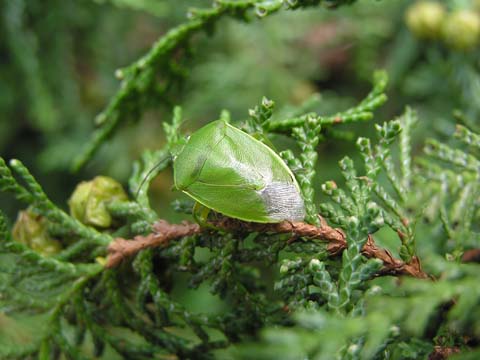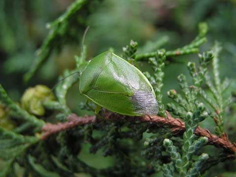 科名 カメムシ科 学名 Glaucias subpunctatus 中名 緑艶椿象 撮影日 2007/09/07 撮影地 東京都葛飾区 特徴 ・全体になめらかで艶がある。 ・肩はあまり張り出さない。 ・鮮やかな緑色。前翅の革質部も緑。 これに似てツヤのないのはアオクサカメムシ、肩が横に張り出した感じになるのがエゾアオカメムシ、前翅の革質部が茶色いのはチャバネアオカメムシ。