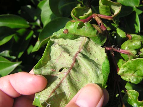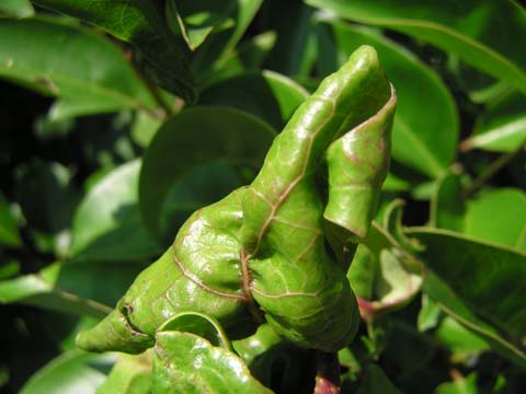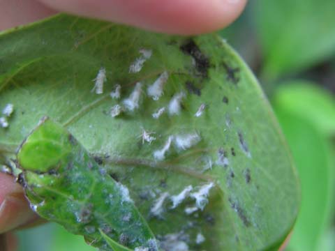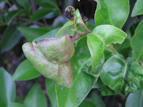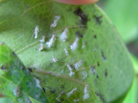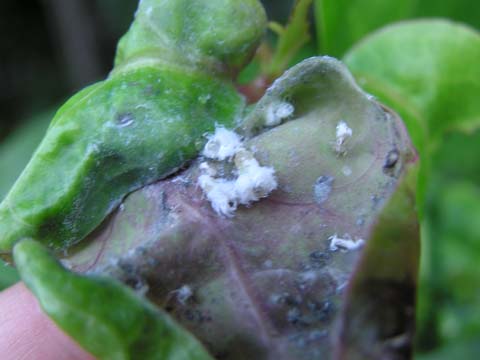 ・丸まった葉を広げると、中に綿を着たシラミかアブラムシのようなものがいる>[