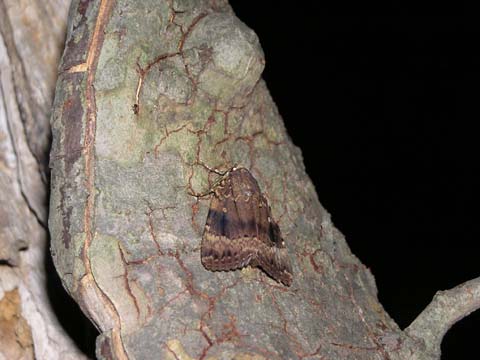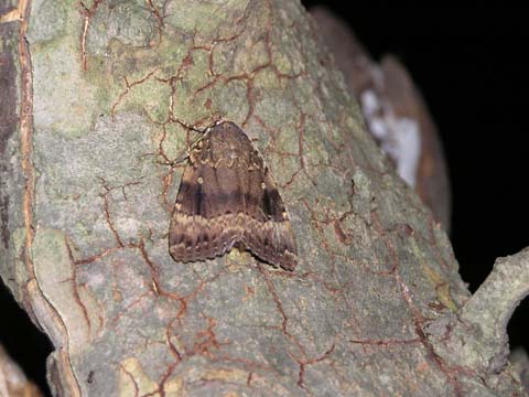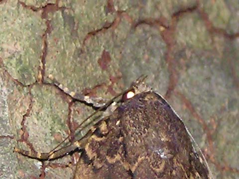 科名 ヤガ科 学名 Amphipyra monolitha 中名 撮影日 2008/08/09 撮影地 東京都葛飾区 特徴 ・逆ハート型のシルエット。 ・前はねの、付け根近くと、外縁近くに白っぽいギザギザの線がある。 ・二本の線の間に小さな白い紋がある。 よく似たシマカラスヨトウは模様がそっくりだが翅が細く、模様のコントラストが弱い。