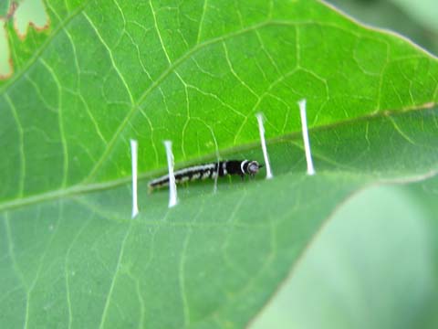 科名 キバガ科 学名 Brachmia triannulella 中名 別名 撮影日 2008/10/09 撮影地 東京都葛飾区 特徴 ・幼虫はサツマイモやヒルガオの葉を食べる。 ・葉を二つ折りにして糸で綴り、その間にかくれている。 ・イモムシとは思えないスピードで動き回る。 ・終齢幼虫は体長15mmくらいで、黒と白のツートンカラー。 備考