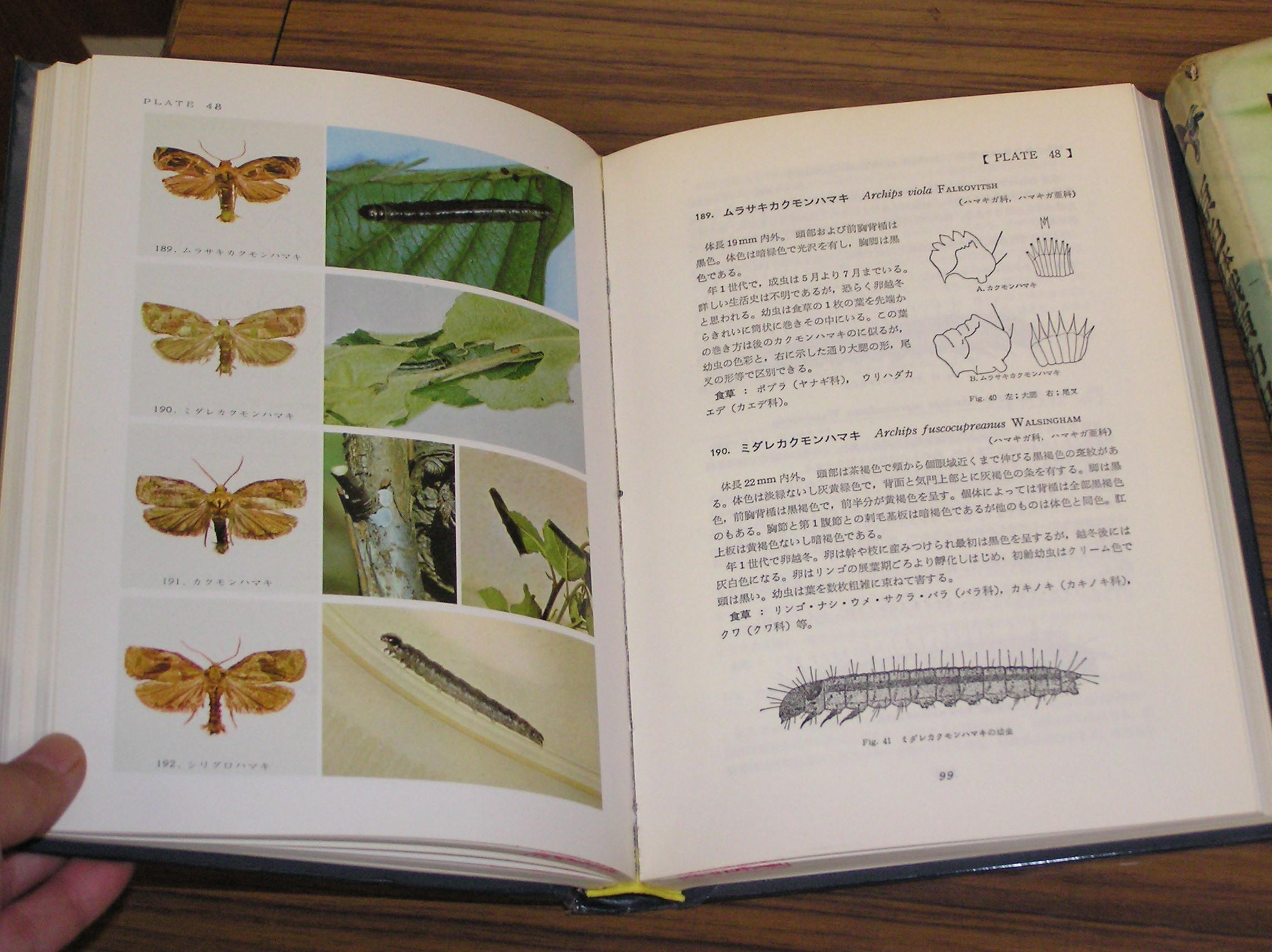 こんな具合に、成虫の写真と幼虫の写真があり、見分け方や生態などの詳細な説明が添えられています。 蛾類幼虫図鑑と同じシリーズで『原色日本蝶類幼虫大図鑑』というのもありますが、こちらは近所の図書館にはないので写真は用意できませんでした。 珍獣様の博物誌でもこの図鑑をかなり参考にしています。どうしても手元に置きたくなって、数年前に本屋さんから注文をかけてみたら、すでに版元品切れで買えなくなっていました。この本を出版した保育社に電話をかけて状況を聞いたところ「絶版ではありませんが、増刷の予定は今のところありません」とのことでした(2000年くらいの話なので、現在は事情が変わっている可能性もありますが)。 ただいま復刊ドットコムにてリクエスト投票を募集しています。下記のリンクから投票ページに行けますので、みなさんご協力ください。 『原色日本蛾類幼虫図鑑』復刊投票ページ