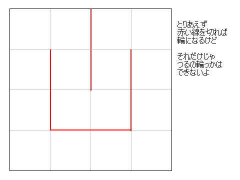 これまでの課題ができれば、こんなおりかたもできるはず。十六羽のつるが羽でつながって輪になっています。大きな正方形の折り紙に、はさみで切り込みを入れて作ります。ノリやセロテープは使いません。どんなふうにはさみを入れればいいかわかりますか? ヒントはこちら