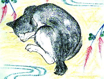 黒白の日本猫なのだが毛足が少し長めで、繊細で絹のような手触り。きりっとした顔立ちと大きな瞳がほんとうに麗しく、こんな美しい猫を他に見たことがないと断言できる。 やせっぽちなのに小さいころからお腹がぽんぽこりんで、猫を飼ったことのなかったわたしはそういう体型なのだと納得していたが、どうやら肝臓肥大だったようだ。5年目くらいに体調が悪化して6歳で死亡。命日は9月14日。 彼女の写真は残っていない。そのかわり絵はいくつか描いた。これは死ぬ半年くらい前に描いたもの。ミリペンで輪郭と毛並みを描いてパステルで色を塗った。もとの絵がでかいのでかなり縮小して取り込んだら、だいぶ毛並みがつぶれてしまった。 |