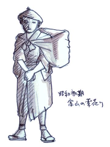 これは昭和初期の富山の薬売り。大きな風呂敷包みの中は薬の入った柳行李(やなぎごおり)。 富山の薬売りは、このファッションで全国を歩いた。 結局、明治の唐辛子売りと、昭和初期の薬売りを足して割ったような絵にしてみたのだけれど…