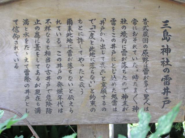 などなど。 とにかく、共通しているのは雷が落ちたのが「三島神社の井戸」であること。井戸に蓋をして閉じこめておいたら、雷が反省して「もうこの土地には落ちません」と約束することです。 三島神社は都内に何カ所かありますが、伝説の舞台になったのは下谷三丁目にある小さな神社です。面白い伝説が残っているわりに有名じゃないらしくて、Yahoo の地図には載ってませんでした。 それでも住所をたよりになんとか訪ねてみました。確かに小さな神社です。でも、歴史を感じさせる古いたたずまいです。鳥居をくぐって、雷さんの井戸を探しました。 雷さんが落ちてくる井戸なら、さぞ大きな井戸なんだろうと思いこんであちこち見回してみたんですけど……あらら、見あたらない。おっかしいなあ。確かにこの場所のはずなのに。 ひょっとしたら立ち入り禁止になっている神社の裏にでもあるのかと思って、社務所の呼び鈴を鳴らそうとしたら、 「はーい、こちらで承りまーす」 って、ピンク色の作務衣を着た女の人が、買い物袋を下げて小走りにやってきました。どうやら買い物に出かけて、ちょうど帰ってきたところのようです。 「あのー、雷さんを閉じこめた井戸ってどこですか?」 わたしがたずねると、女の人は「それならこちらになりますよー」と、とても愛想よく案内してくれたんですけど、案内されてびっくり、 「ありゃ、入り口にあったんですね!」 鳥居を入ってすぐのところに小さな井戸があって、ちゃんと雷井戸って書いてありました。由来を説明する札も立ってるんですけど、木の枝が茂っていて、パッと見よくわからなかったのです。 井戸は想像してたのよりずっと小さくて、形は四角。竹(を模した棒)で井桁に編んだ覆いがしてありました。 案内してくれた女性にお礼を言ってから井戸の中をのぞいて見ました。