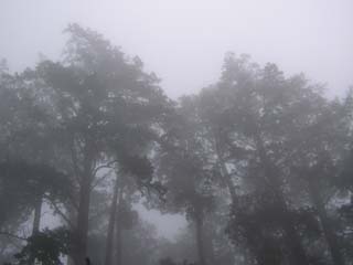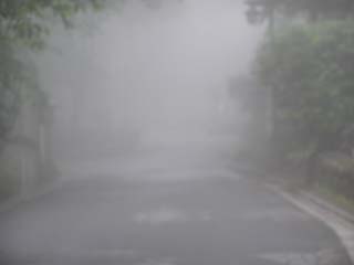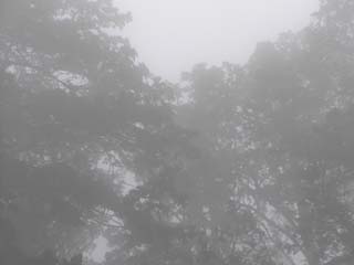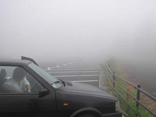 ここいらへん、海抜何メートルあるんでしょう。わざと車を入れて写してみたんですけど、すぐそこまで霧で真っ白なのがわかるでしょうか。 これ、ただの霧じゃないんですよ。雲。雲の中に入っちゃってるの! ちなみに、駐車料は一日500円(普通車)だったと思います。