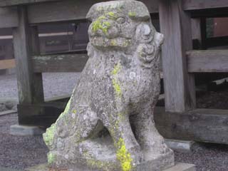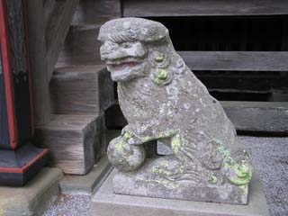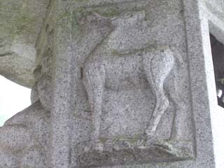 でもごめんなさい、お堂は写し忘れました。右の写真は石灯籠に掘られた鹿です。国常立って鹿となんか関係ありましたっけ? 下は狛犬です。ここだけ山犬ではなく狛犬でした。 |