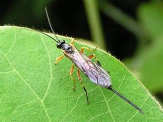 コマユバチ科のハチにも非常に長い産卵管を持つものがいる。有名なところではウマノオバチだろうか。体の数倍もの長さの産卵管を持ち、馬の尾のように見えるため、中国でも馬尾繭蜂と呼んでいる。この蜂の産卵管は生きているときは一本に見えるが、死ぬと三本に分かれる。 また、ヒメバチ科のハチのメスにも長い産卵管を持つものがいる。アカアシフシヒメバチはヨーロッパ・シベリア・日本に棲息する。これも死ぬと産卵管がわかれる。 |