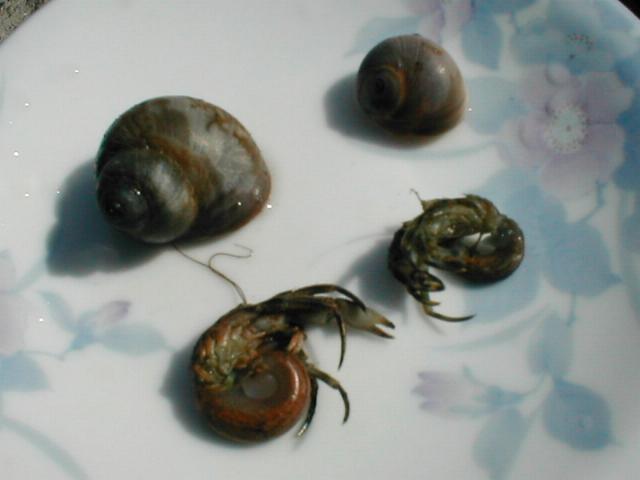 | ヤドカリは翌日に、貝は 3日後にみんな死んでしまいました。 |
