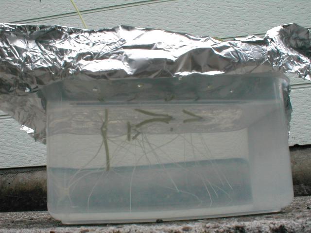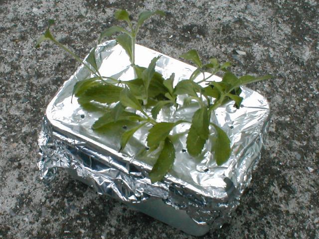 それはともかく、やっと咳がおさまってまいりました。やれやれ、ひどい咳だった。 ところで、風邪騒動で書くのを忘れていたのですが、先月の日記に書いたステビアが発根して、かなりいい感じになってきました。 こんなふうに、容器にアルミホイルをかぶせて楊子で穴をあけ、ステビアの芽を刺しておいたのですが…… このとおり、見事な根っこが生えてます。 植木鉢に移してみました。 育つでしょうか? |
